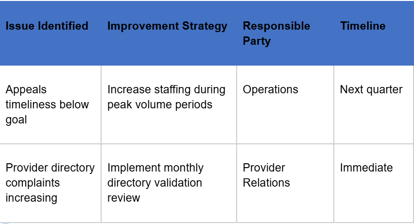 “Trend analysis of complaint categories shows a 30% increase in complaints related to provider directory accuracy. The committee determined that the increase coincided with recent network expansion into a new county—a 30% increase in practitioners over the previous network.” The committee directed the provider relations team to review data validation processes, establish a timeframe for completing those validations, and implement a more efficient update process. They also recommended increased member communication about network changes to manage expectations.