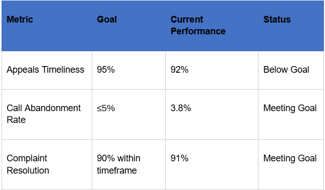 “The committee reviewed the improvement plan implemented last quarter to address Appeals Timeliness. Following the staffing adjustments, performance increased to 96%, exceeding the target goal. The committee voted to continue the staffing model for the next reporting cycle.”